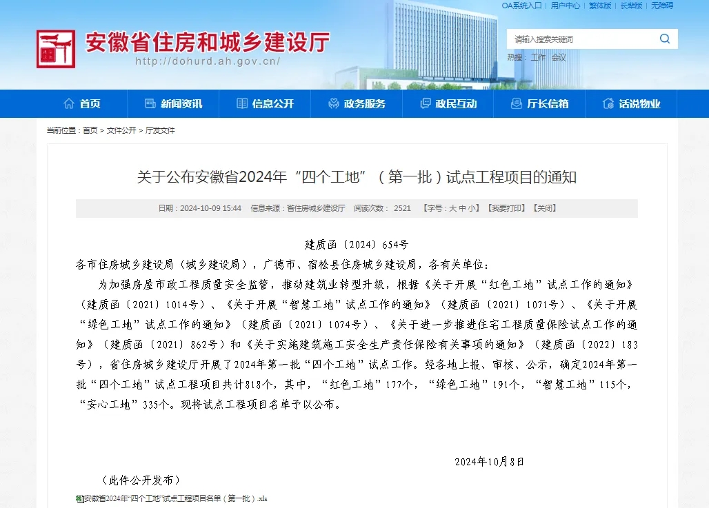 目前,安徽省2024年“四個工地”(第一批)試點工程項目名單已公布,我市共有“紅色工地”試點工程項目6個,“綠色工地”試點工程項目7個,“智慧工地”試點工程項目5個,“安心工地”試點工程項目13個。